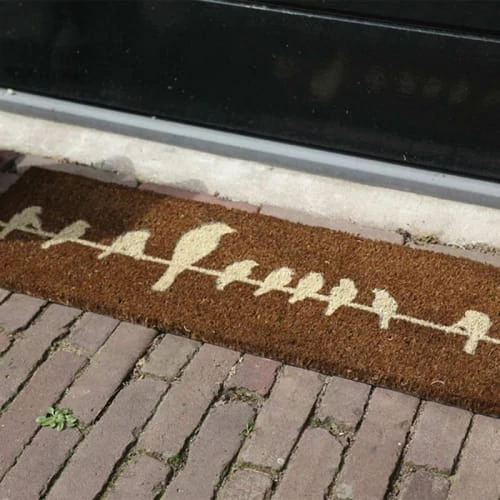 Format original de ce tapis en fibres et coco avec un oiseau sur le fil. Format permettant de l’utiliser dans votre entrée ou sur les marches de votre escalier. Le verso en caoutchouc est anti dérapant. Dimensions : 75 cm x 25 cm x 2 cm