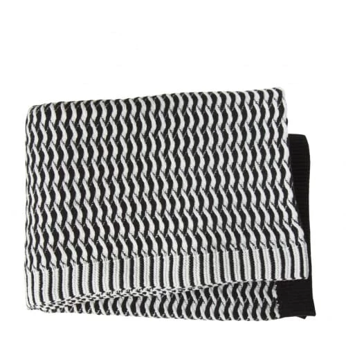 : Ce plaid est tricoté en utilisant la technique du jacquard à fil flottant de 2 couleurs.