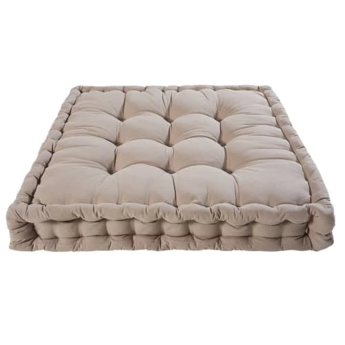Vous prendrez goût au confort de ce matelas en coton taupe 90×90 cm, idéal dans un salon convivial ou sur une terrasse ensoleillée !